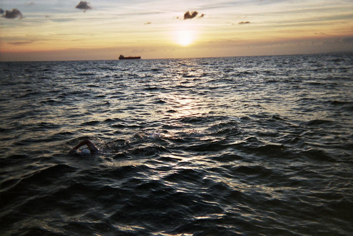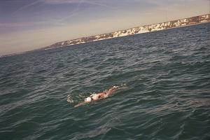 "Here come the boats!" That P&O ferry almost got you! The passengers on board are waving at you - you do some backstroke to look, wave back at them, and laugh! You are in such great spirits. You even make a joke: "$10 bucks says I beat the ferry." Our boat has stopped rocking so much, and the seas have calmed down a bit. Andy's still smoking. So are you!